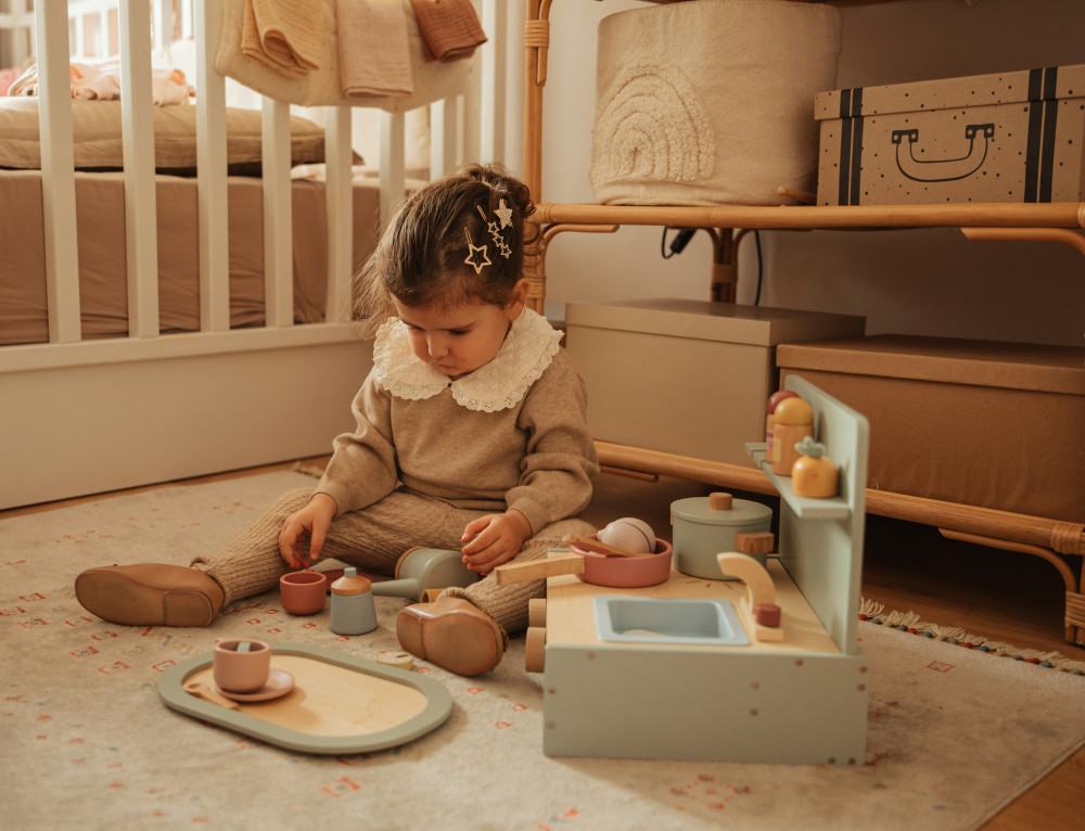 Der Schaumspielboden Plum ist als weiche und angenehme Unterlage konzipiert, die dem Baby einen sicheren Ort zum Spielen, Liegen und Krabbeln bietet. Er dient auch als stabile Basis für Aktivitätsgestelle und andere Spielsituationen.